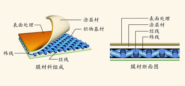 膜材料一般分PVC、PTFE和ETFE膜三大類。PVC膜是以聚酯纖維作基材,覆以PVC形成的;PTFE膜材的基材是玻璃纖維;而ETFE膜則是沒有基材,直接成膜。
